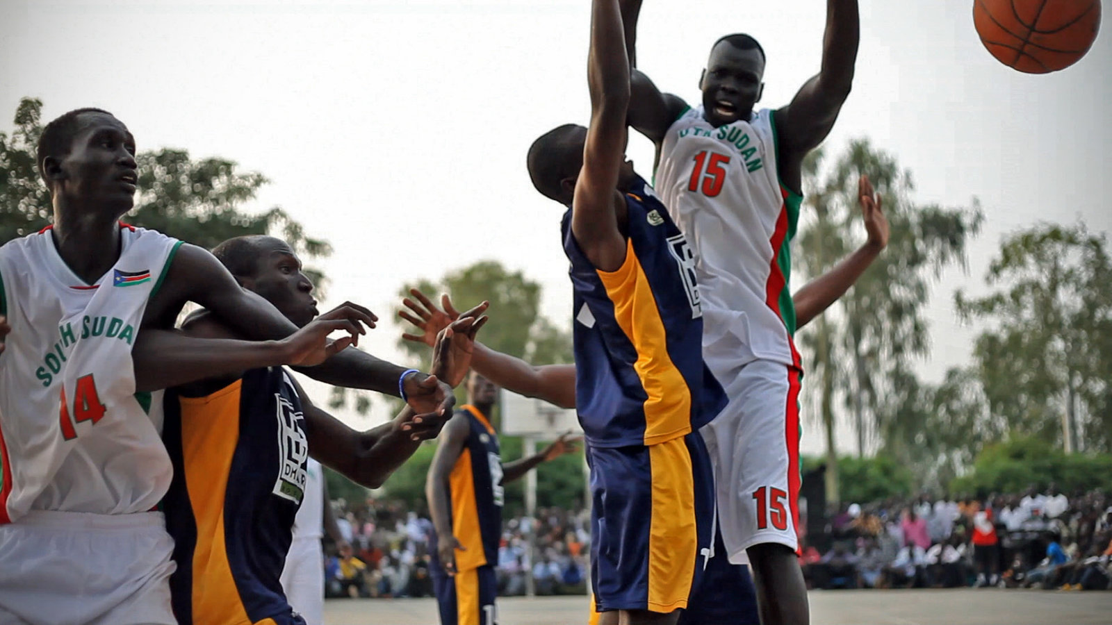 Agel Ring Machar (ganz rechts) beim Spiel seiner Mannschaft gegen Uganda.Bild: © ZDF und Katharina von Schröder