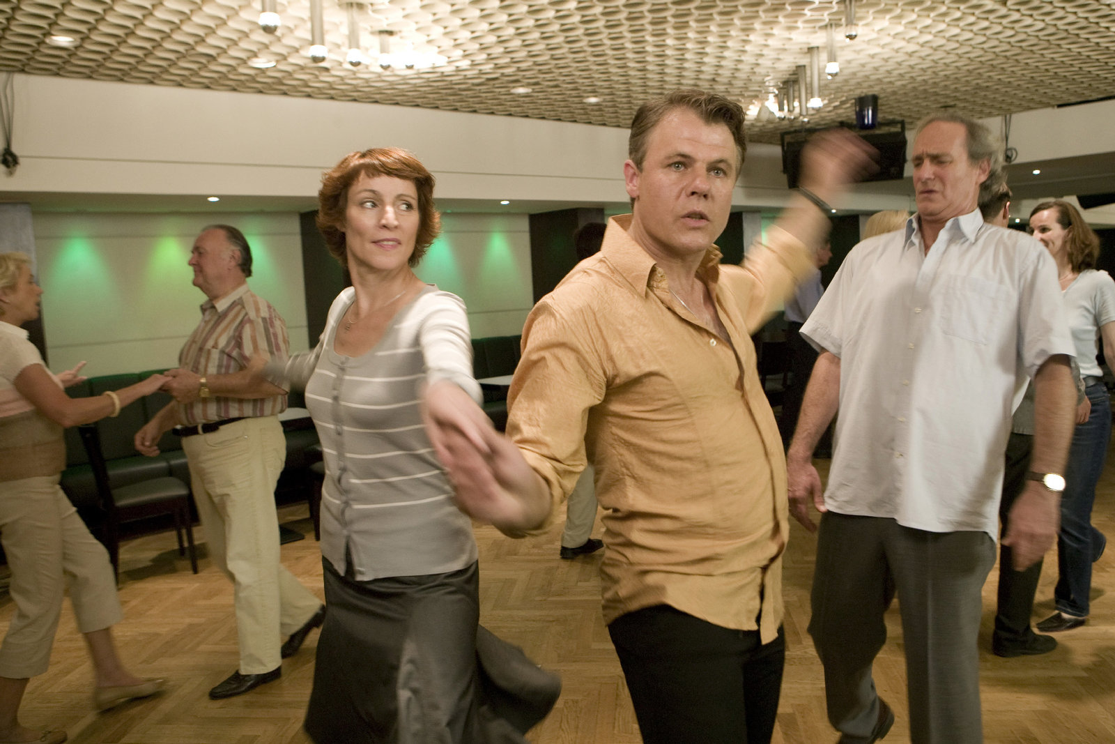 Richard Harms (August Zirner) mit seiner Frau Gisela (Kirsten Block) beim Tanzunterricht - Tanzlehrer Pedro (Rainer Furch) zeigt dann, wie es wirklich geht.Bild: © ZDF und Thomas Kost