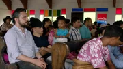 Somewhere in TongaGegensätze treffen aufeinander: Wolski (Sascha Alexander Gersak) und Marcel (Luis Pintsch) beim Gottesdienst auf Tonga.Bild: © ZDF und Yannick Bonica