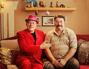 Rosa von Praunheim (Rosa von Praunheim, l.) berät Hanno Herbst (Heiko Pinkowski, r.) zur Erziehung seines Sohnes Flori.Bild: © ZDF und Dennis Pauls