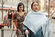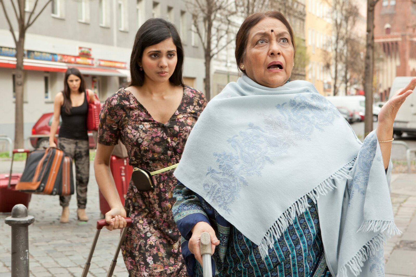 Marry Me! - Aber bitte auf IndischAnkunft der indischen Oma vor dem Café Devi: Sujata (Bharati Jaffrey, r.) beschwert sich bei Sonal (Mira Kandathil, 2.v.l.) über den "Dreck" an ihrem Mietshaus. Im Hintergrund schleppt Kissy (Maryam Zaree, l.) Koffer.Bild: © ZDF und BRITTA KREHL./BRITTA KREHL