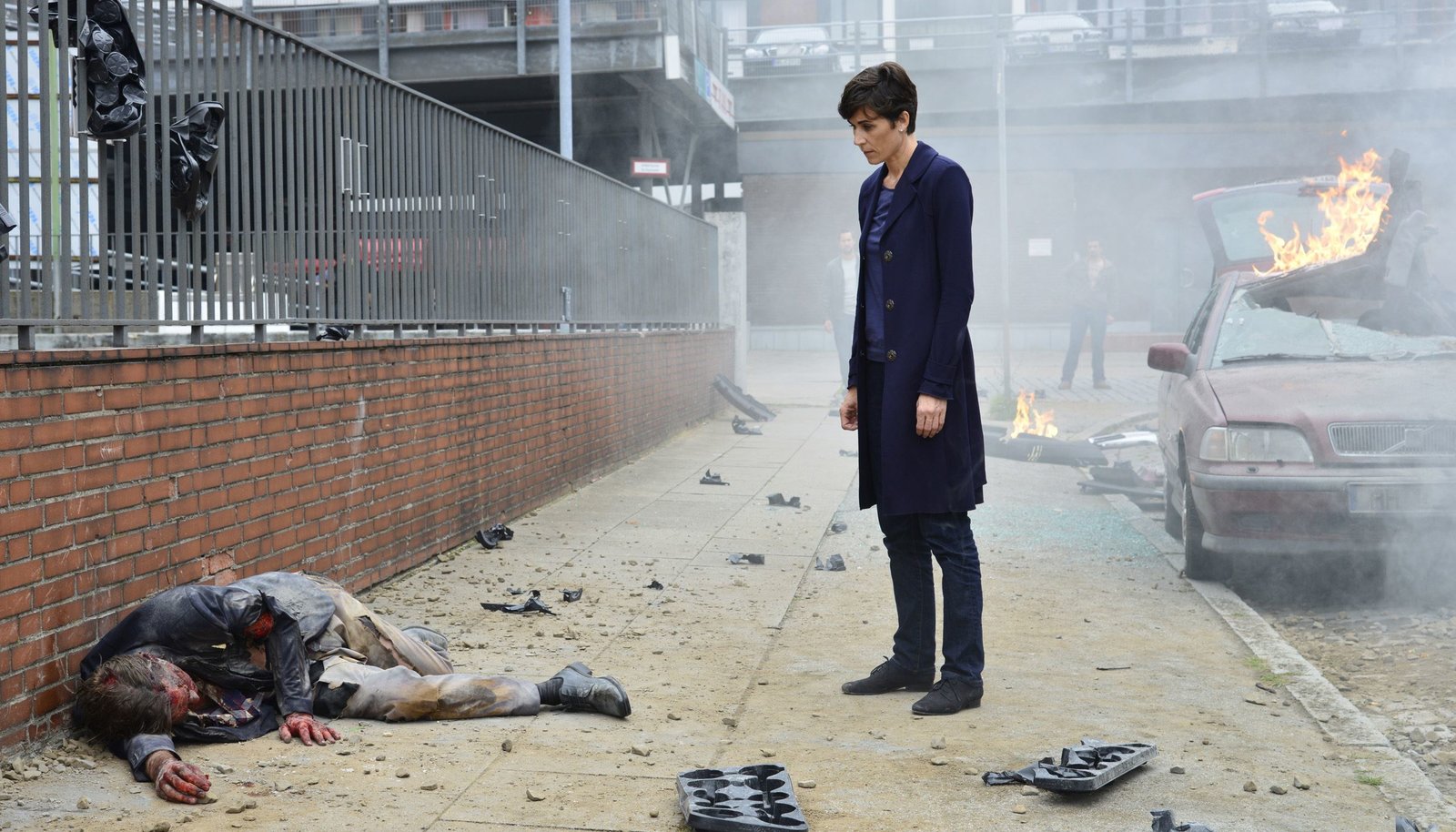 Teil 1Tödlicher Anschlag im Auftrag Darankows: Die LKA Beamtin Ursula Thern (Nina Kunzendorf) findet am brennenden Auto ihren Kollegen Lars Hameister (Kai Ivo Baulitz) tot nach der Explosion einer Autobombe.Bild: © ARD Degeto/Christiane Pausch