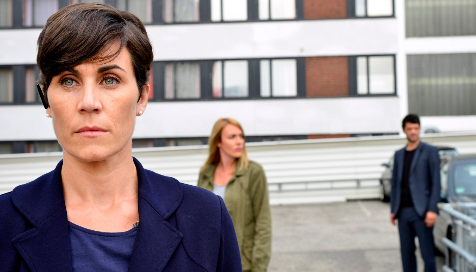 Teil 1Das LKA-Team Mario Kreutzer (Carlo Ljubek, li.), Nadja Lenz (Alwara Höfels, Mitte) und Urusula Thern (Nina Kunzendorf) verschaffen sich vor der der Wohnung des Kronzeugen Victor Miro einen Überblick.Bild: © ZDF und ARD Degeto/Christiane Pausch
