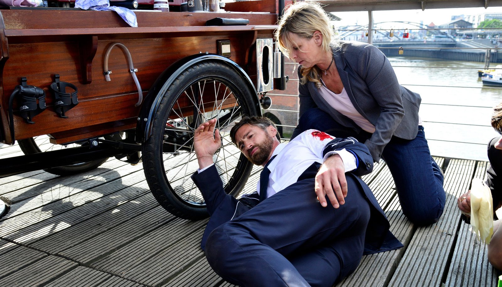 Teil 1Der Bankangestellte Simon Dreher (Benjamin Sadler) wird in seiner Mittagspause angeschossen. Es eilt ihm eine Zivilbeamtin (Dani Stein) zur Hilfe.Bild: © ZDF und ARD Degeto/Christiane Pausch