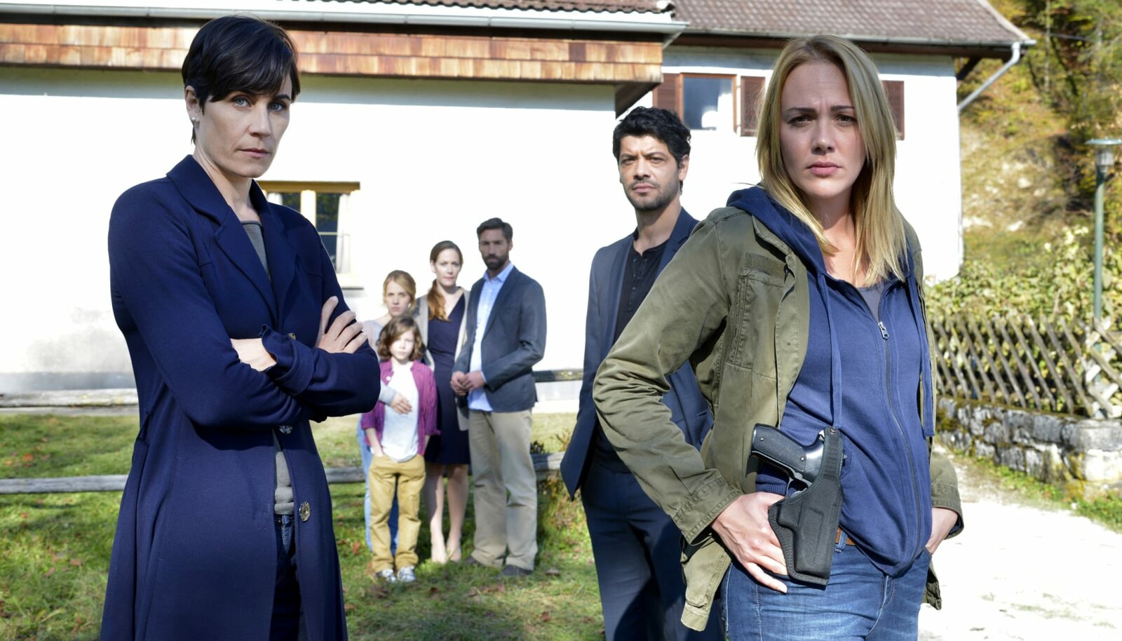 Teil 2LKA-Ermittlerin Ursula Thern (Nina Kunzendorf, li.) betreut mit ihren Kollegen Mario Kreutzer (Carlo Ljubek, 2. v. re.) und Nadja Lenz (Alwara Höfels, re.) im Zeugenschutzprogramm eine Bankerfamilie (hinten von links nach rechts.): Vater Simon Dreher (Benjamin Sadler), Mutter Rieke (Stephanie Japp), Tochter Lona (Paula Kalenberg) und Sohn Anton (Daan Lennard Liebrenz).Bild: © SWR/ARD Degeto/Christiane Pausch
