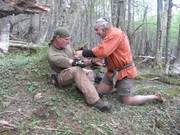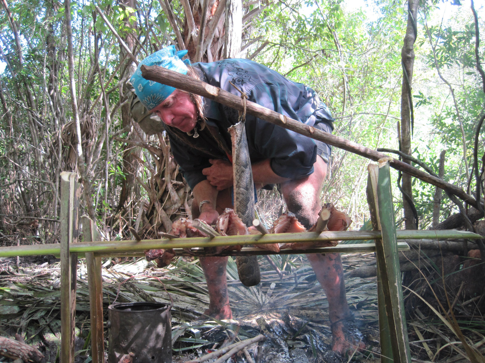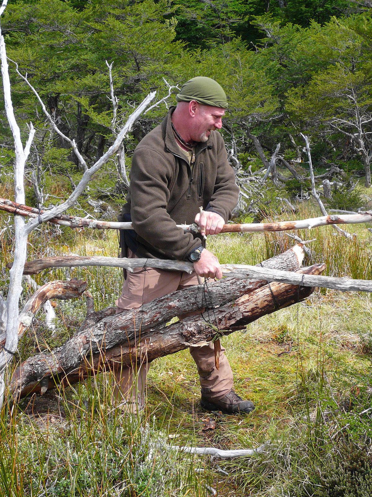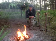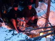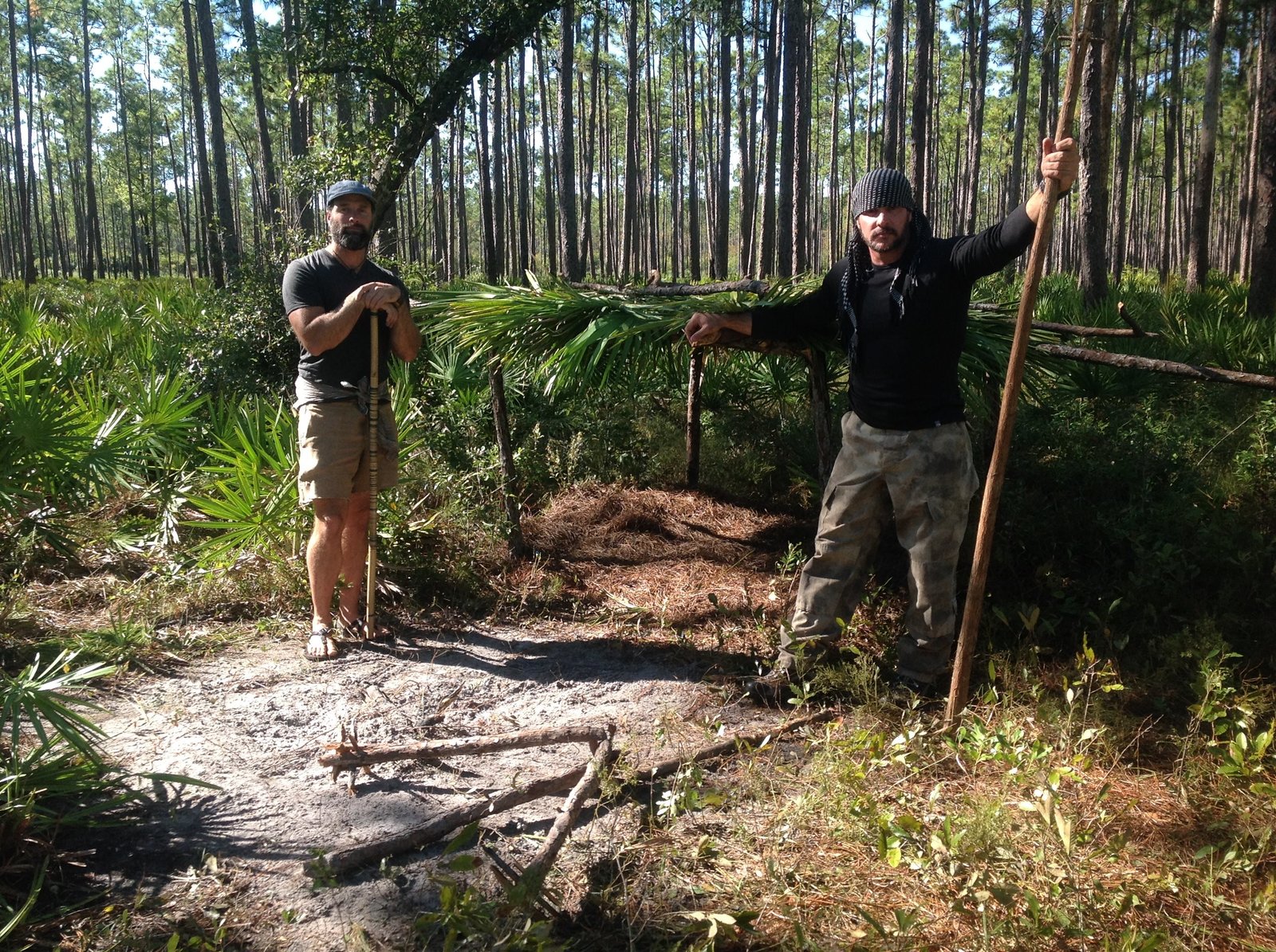 In den Sümpfen GeorgiasMatt Graham and Joe Teti posing by shelter with blow gun spear.Bild: © -- Discovery Networks Picture Publicity. This picture may be used solely for Discovery Networks programme publicity purposes. May be reproduced in editorial press & listings in connection with the cur