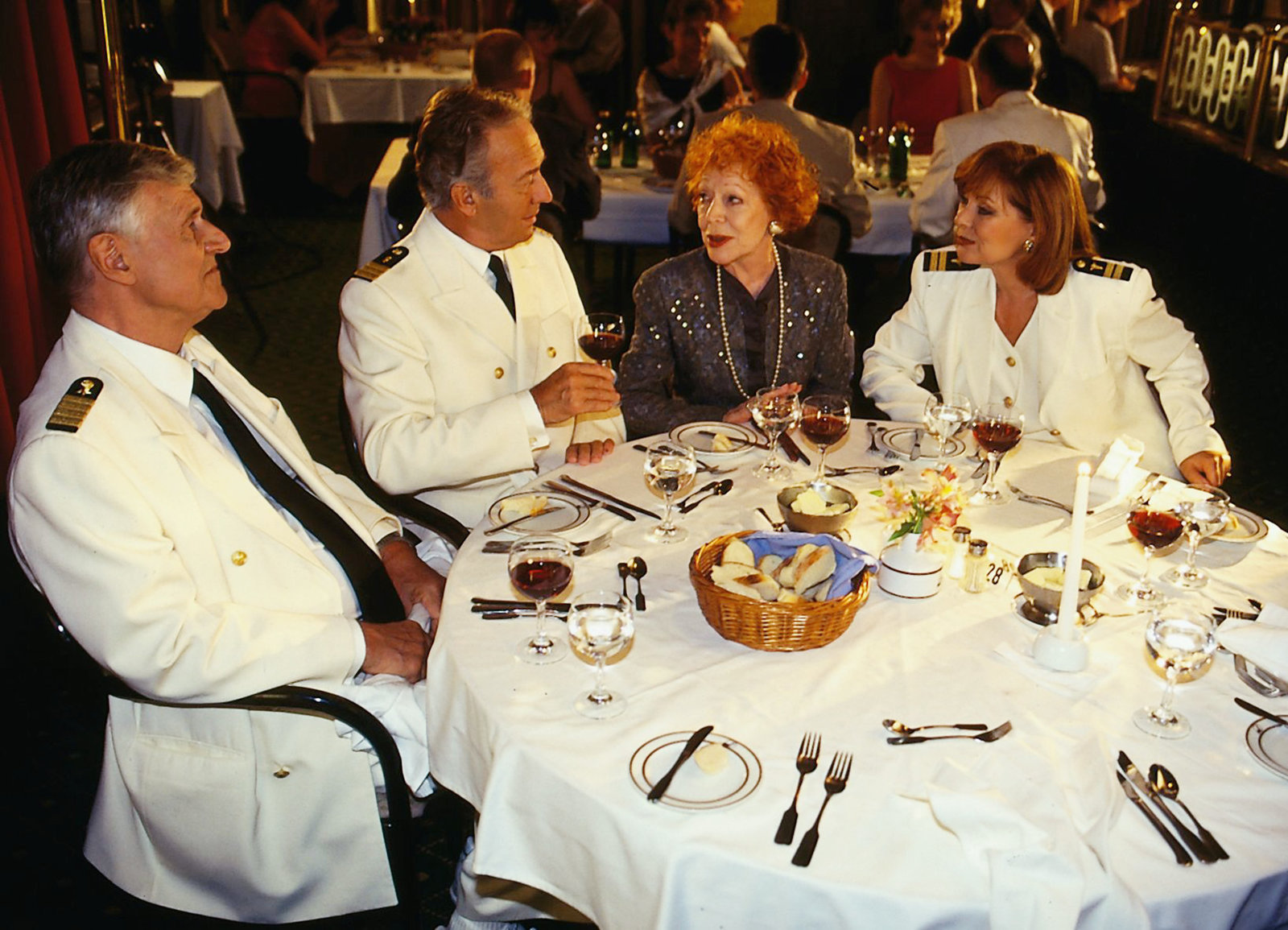 ArgentinienFestliches Abschlussdinner: Horst Naumann als Dr. Horst Schröder, Heinz Weiss als Kapitän Hansen, Gisela Trowe als Mutter von Beatrice, Heide Keller als Chefhostess BeatriceBild: © SRF/ZDF