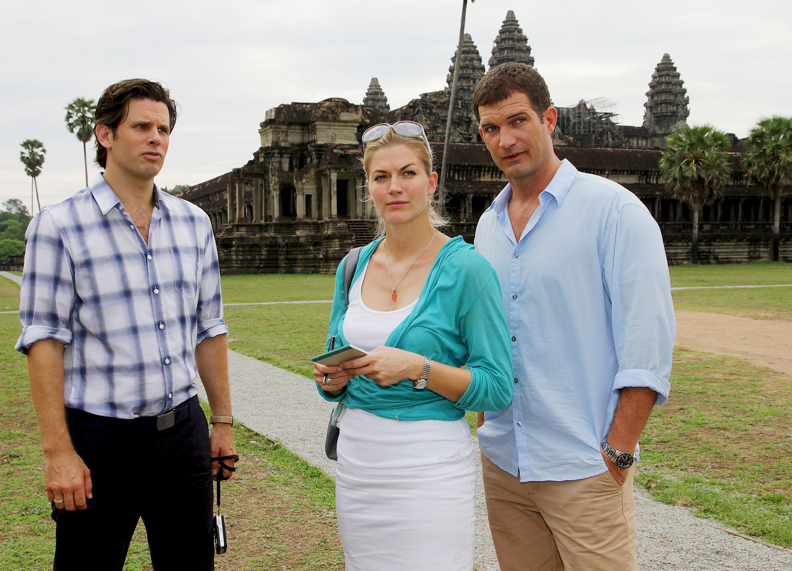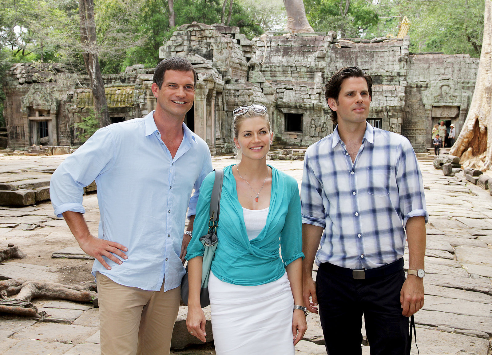KambodschaAusflug nach Angkor Wat: Steffen Groth als Tobias Förster, Nina Bott als Manuela Förster, Simon Böer als Benjamin HellwigBild: © SRF/ZDF