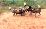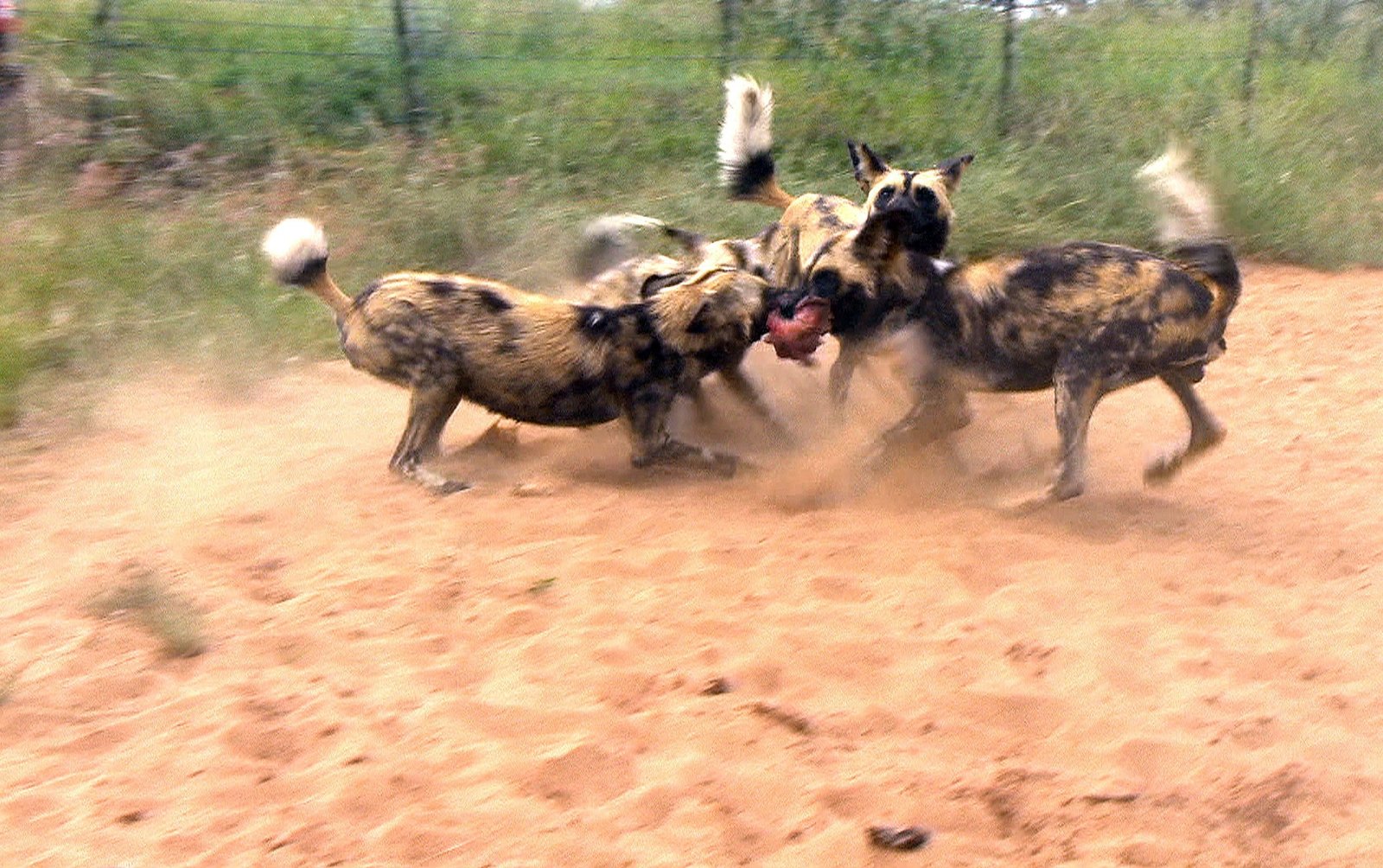 Folge 7Das Wildhunderudel kämpft wie in der freien Wildbahn um die zugeworfene Beute.Bild: © SWR