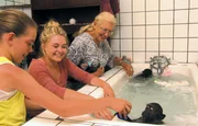 Folge 89ARD/SWR DAS WAISENHAUS FÜR WILDE TIERE FOLGE 89, "Abenteuer Afrika", am Dienstag (03.03.15) um 16:10 Uhr im ERSTEN. Die kleinen Paviane Bella, Floiki und Olli in Marietas Badezimmer.Bild: © SWR/Simon Schanach