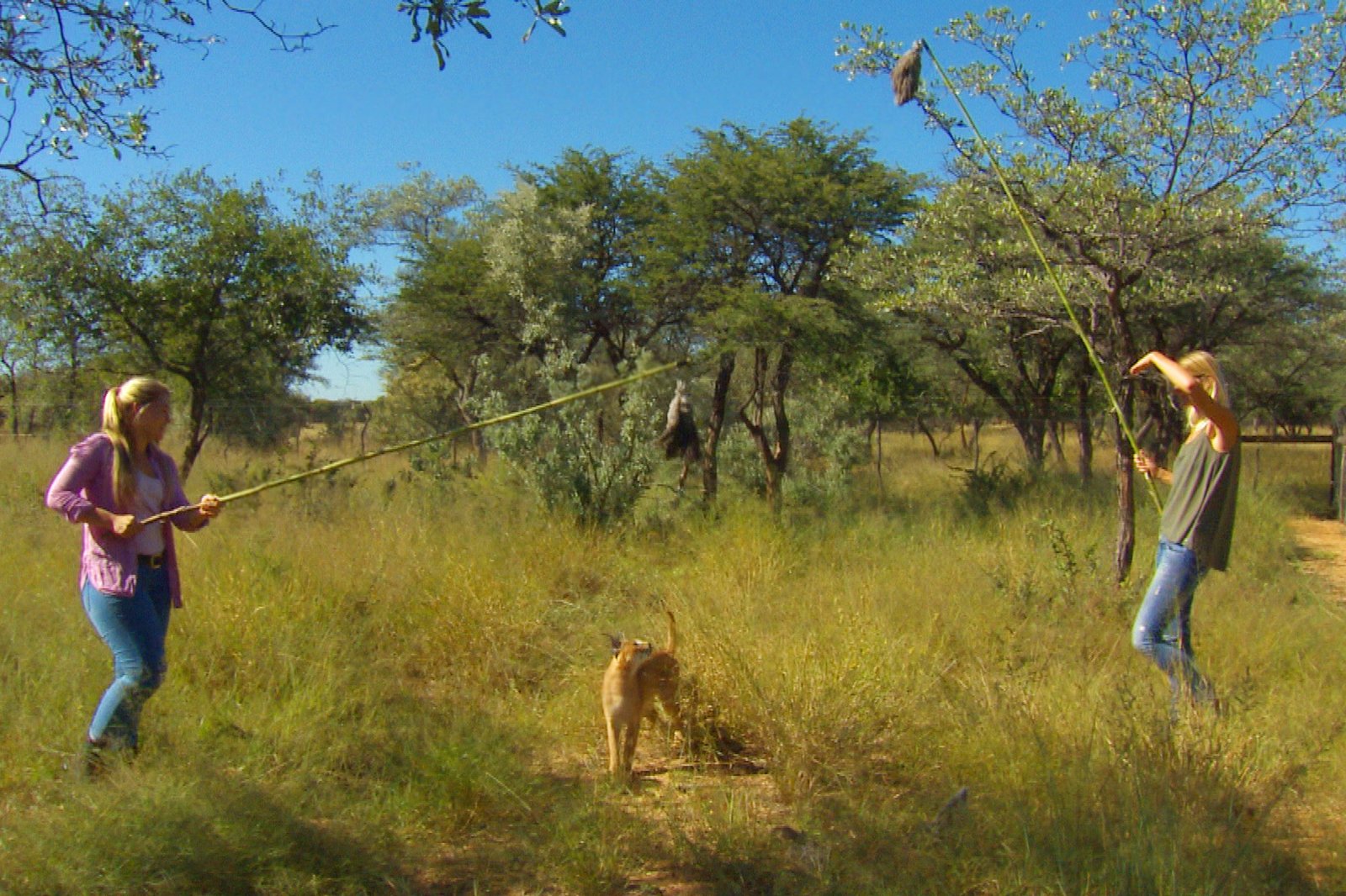 Heute: Fitnessprogramm für die Karakale Samar und Aviel mit Morgan van der Merwe und Annika Funke.Bild: © SWR/Michael Lange