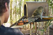 Folge 43Volontär Moritz hat der blinden Grünen Meerkatze Audrey ein Testbrett gebastelt.Bild: © SWR/Michael Lange