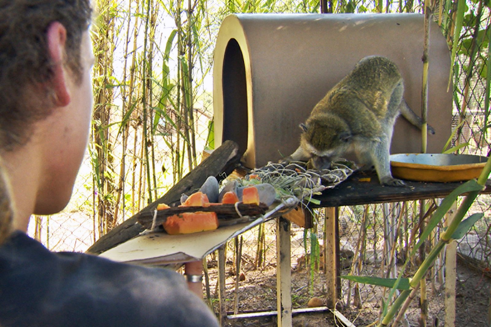 Folge 124ARD/SWR DAS WAISENHAUS FÜR WILDE TIERE FOLGE 124, "Abenteuer Afrika", am Mittwoch (29.04.15) um 16:10 Uhr im ERSTEN. Volontär Moritz hat der blinden Grünen Meerkatze Audrey ein Testbrett gebastelt.Bild: © Michael Lange / BR, SWR / BR/SWR/Michael Lange