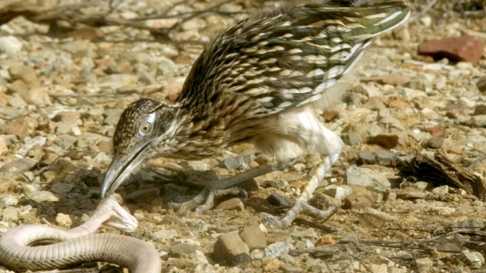 Zwischen Felsen und KakteenDer Wegekuckuck, auch in Deutschland eher unter seinem amerikanischen Namen Roadrunner bekannt, jagt und erlegt sogar Giftschlangen.Bild: © ZDF/National Geographic Creative
