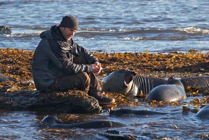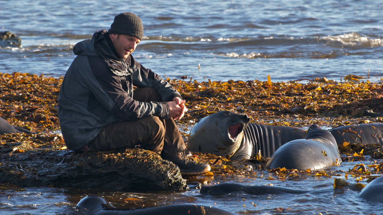Die Killerwal-InselDave Salmoni with elephant seals on Sea Lion Island, Falklands.Bild: © Discovery Communications