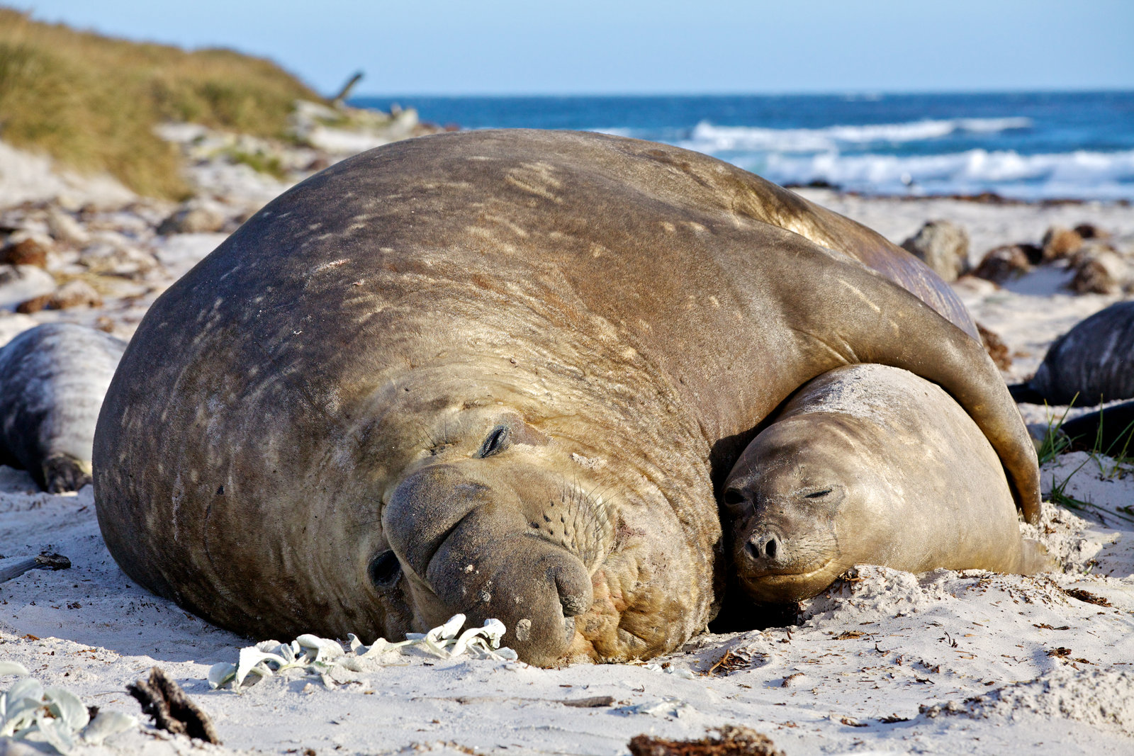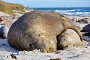 Die Killerwal-InselElephant seal bull with seal pup, Sea Lion Island, Falklands.Bild: © Discovery Communications/Photographer: Paul D. Stewart