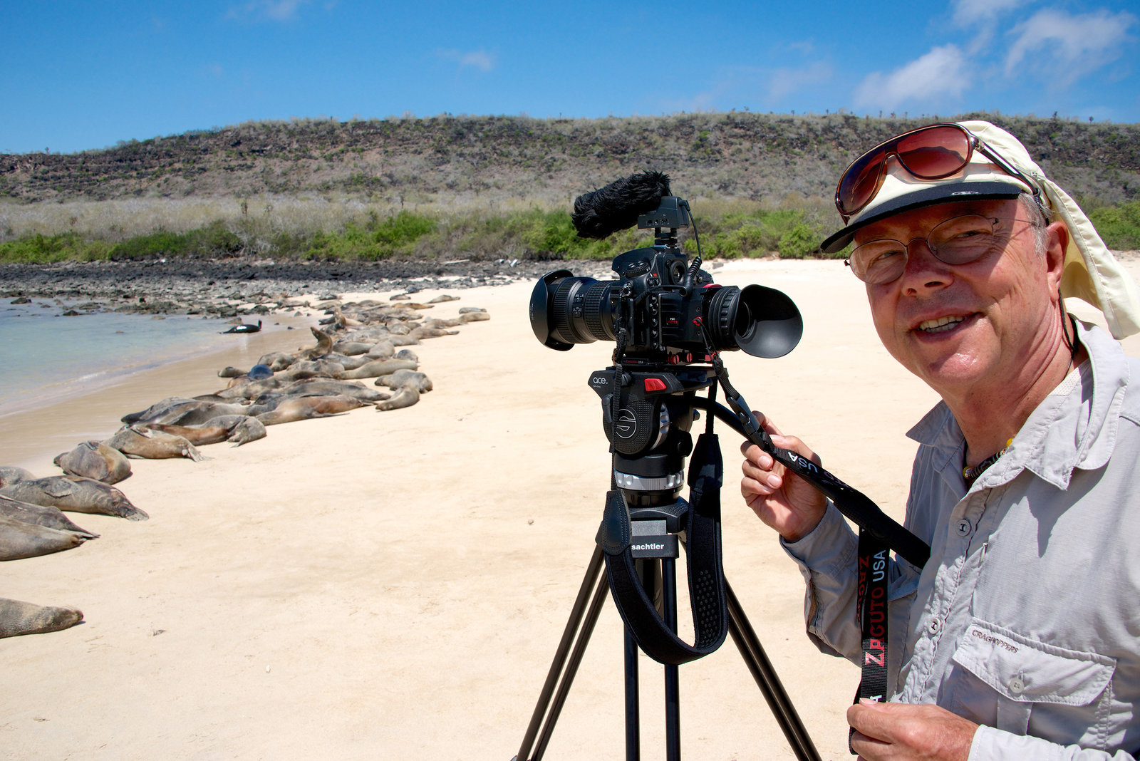 Löwen, Haie und ein StaatspräsidentDokumentarfilmer Otto C. Honegger bei der Arbeit mit Seelöwen, die sich an der Äquatorsonne räkeln.Bild: © ORF III