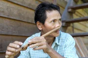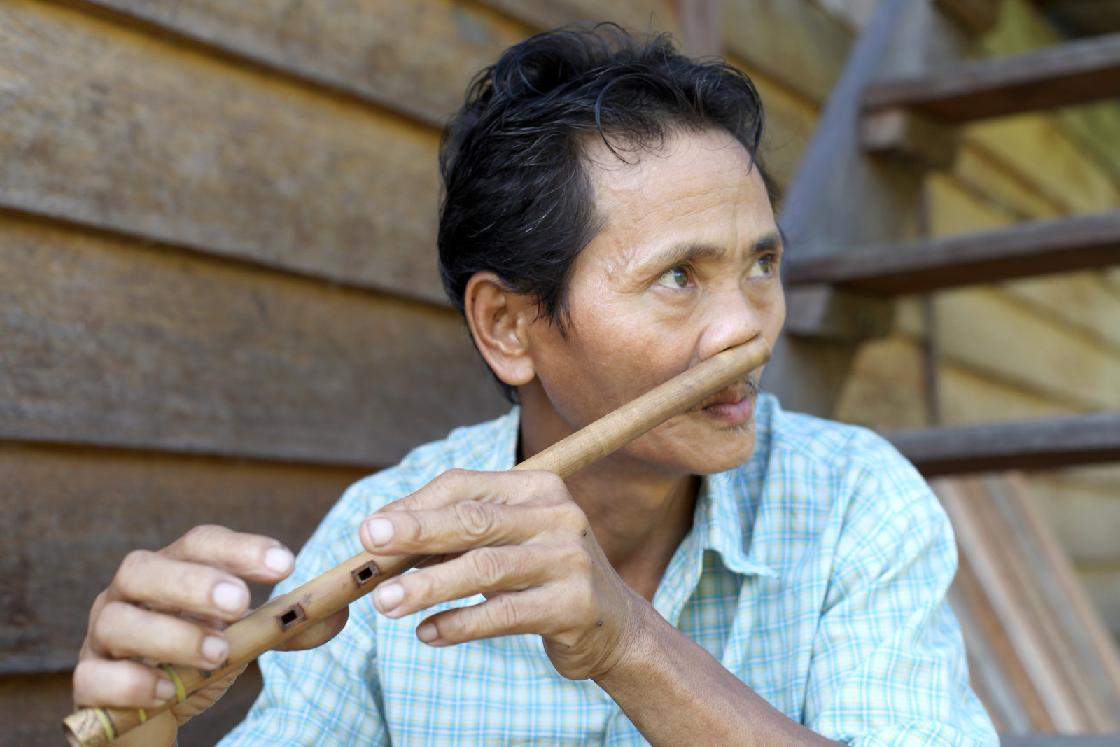 Schlangen, Schweine, SchönheitswahnHossein Geng spielt die Nasenflöte, ein traditionelles Musikinstrument der Penan.Bild: © ORF III