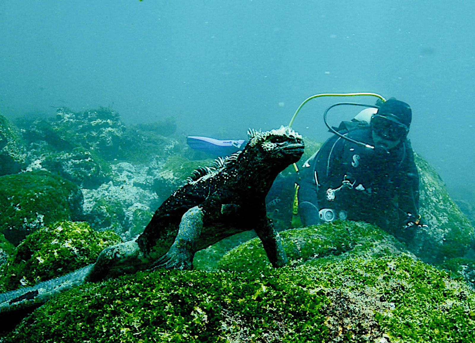 Gott, Botox und UrtiereGalapagos - Touristenführer Mathias Espinosa betrachtet eine Meerechse unter WasserBild: © ZDF und SRF