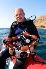 Löwen, Haie und ein StaatspräsidentDer bekannte Unterwasserfotograf und -Filmer Otto C. Honegger mit seiner wasserdichten Kameraausrüstung vor einem Einsatz.Bild: © ORF III