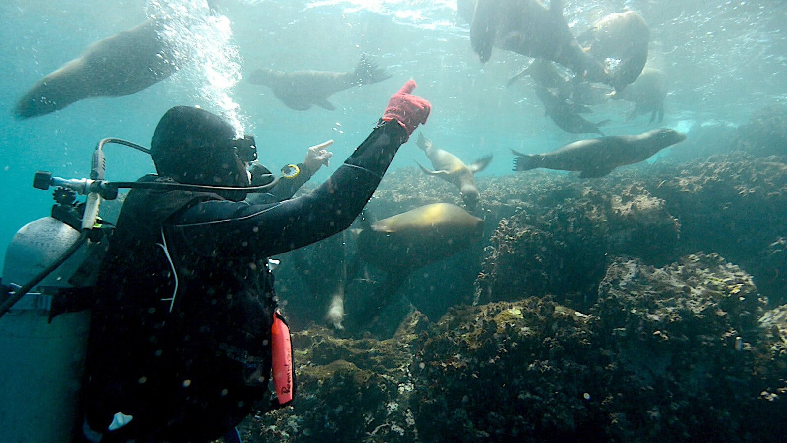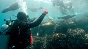 Löwen, Haie und ein StaatspräsidentNationalparkguide Mathias Espinosa als Dirigent eines Seelöwenballetts. Die verspielten Säugetiere freuen sich offensichtlich über den Besuch von Tauchern.Bild: © 3sat