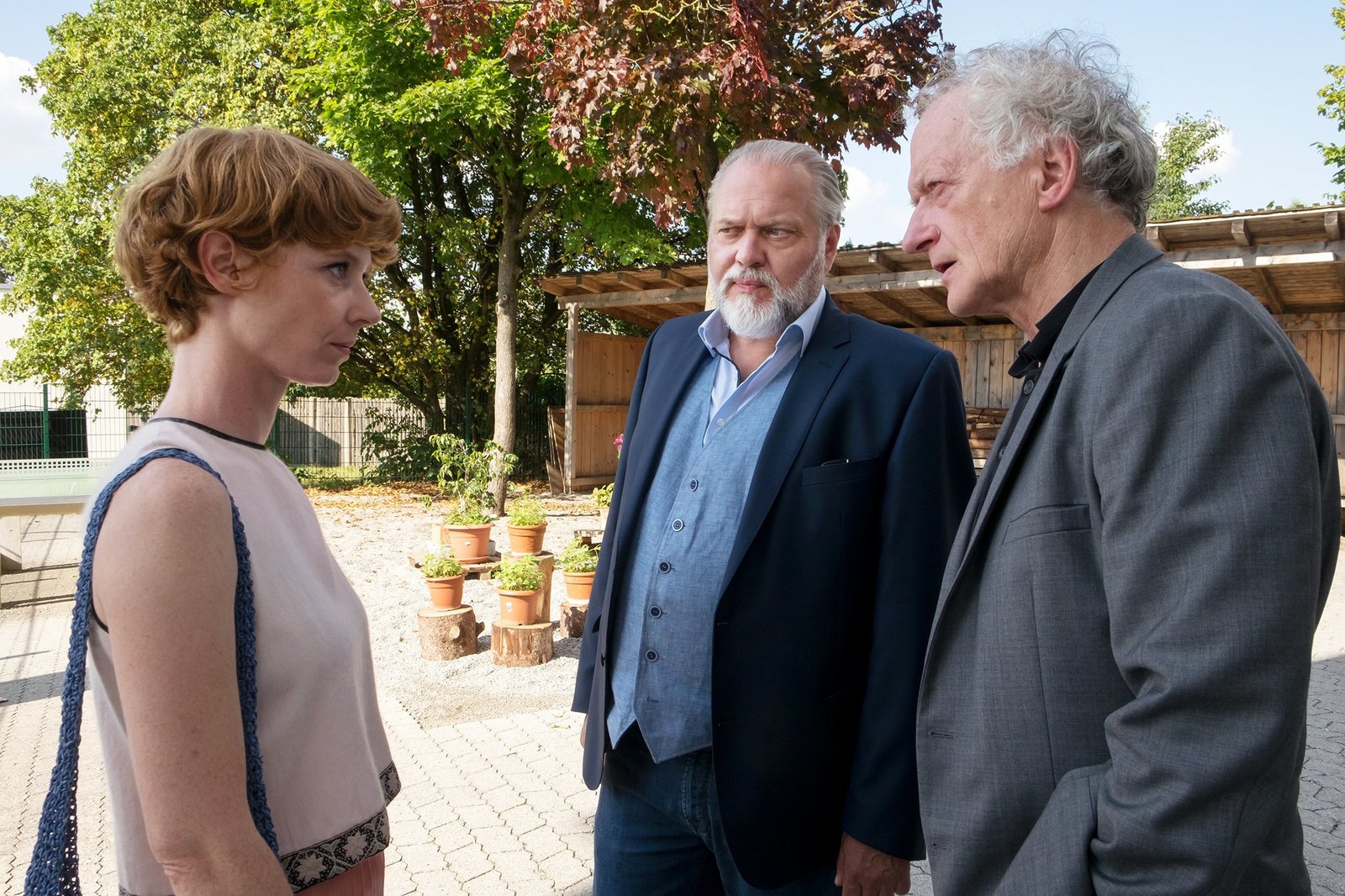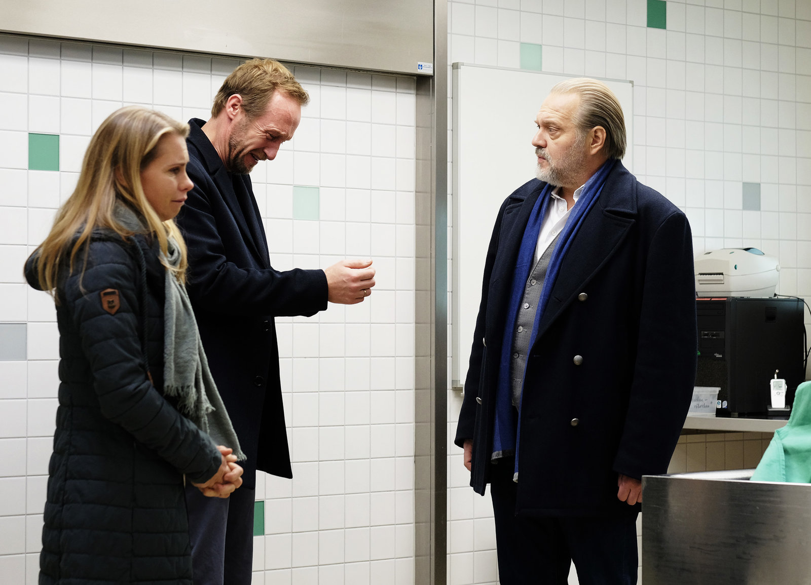 FamilienbandeProf. Scholz (Falk Rockstroh, r.) rückt ins Zentrum der Ermittlungen von Hauptkommissar Richard Voss (Jan-Gregor Kremp, M.) und seinem Team. Der Arzt hatte die ermordete Lehrerin unter Druck gesetzt. Das Gleiche versucht er nun mit der Physiklehrerin Claudia Lutz (Sahra Bauerett).Bild: © SRF/ZDF/Erika Hauri