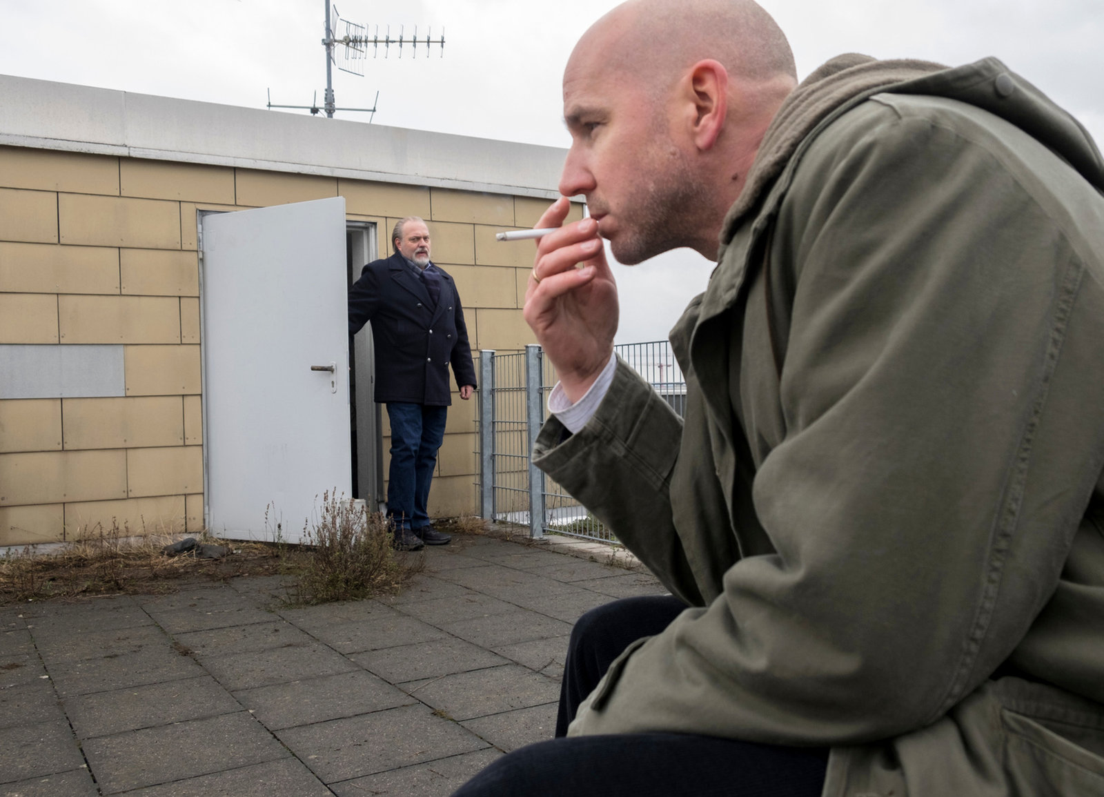 AufstiegskampfDer Vater des Toten raucht nachdenklich: Jan-Gregor Kremp als Richard Voss, Paul Herwig als Bernd RotthoffBild: © SRF/ZDF/Erika Hauri