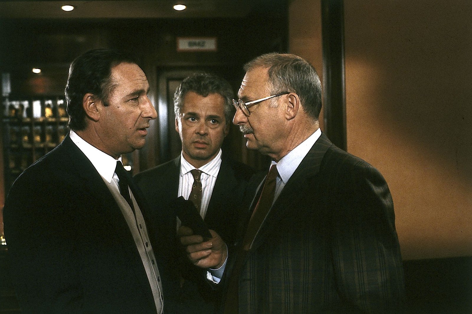 Der Tod hat kein Lied20. Nichts gesehen und nichts gehört zu haben, behauptet der Empfangschef (Henry van Lyck) eines großen Hotels Gerd Heymann (Michael Ande) und Leo Kress (Rolf Schimpf) gegenüber.Bild: © ZDF; Neue Münchner Fernsehproduktion