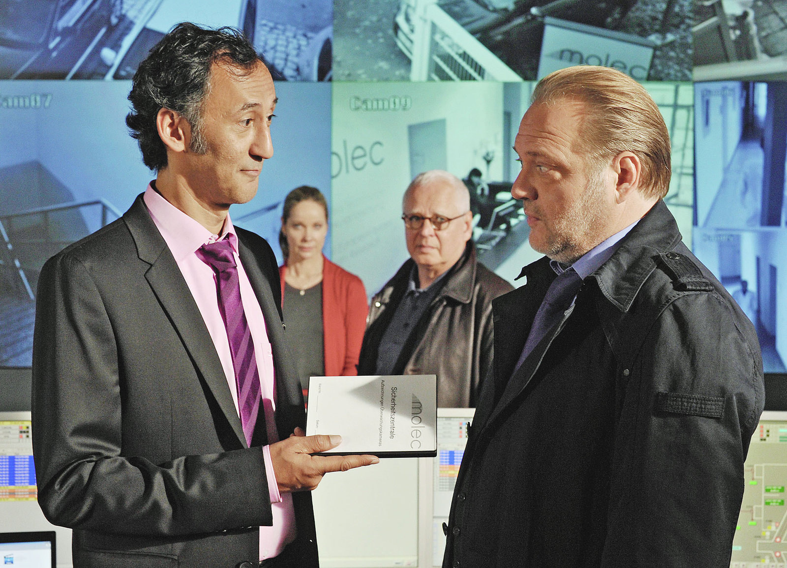 Der Tod in dirEine DVD und ein geheimnisvoller Blick: Ercan Durmaz als Carlos Block, Ann-Kathrin Kramer als Isabell Rudloff, Michael Ande als Gerd Heymann, Jan-Gregor Kremp als Richard VossBild: © SRF/ZDF/Michael Marhoffer