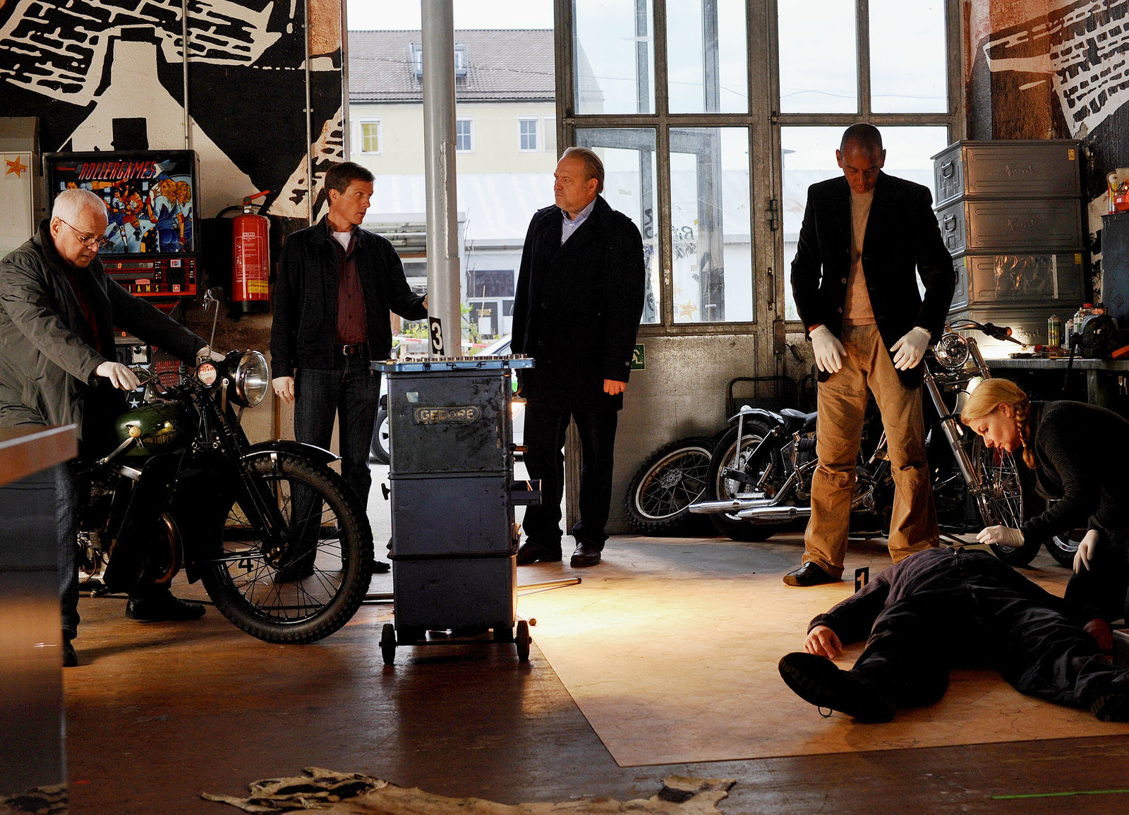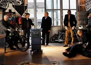 Zwischen Leben und TodMordopfer in der Werkstatt: Michael Ande als Gerd Heymann, Markus Böttcher als Werner Riedmann, Jan-Gregor Kremp als Richard Voss, Pierre Sanoussi-Bliss als Axel Richter, Marko Dyrlich als Dirk Faber, Christina Rainer als Dr. Franziska SommerfeldBild: © SRF/ZDF/Michael Marhoffer