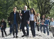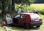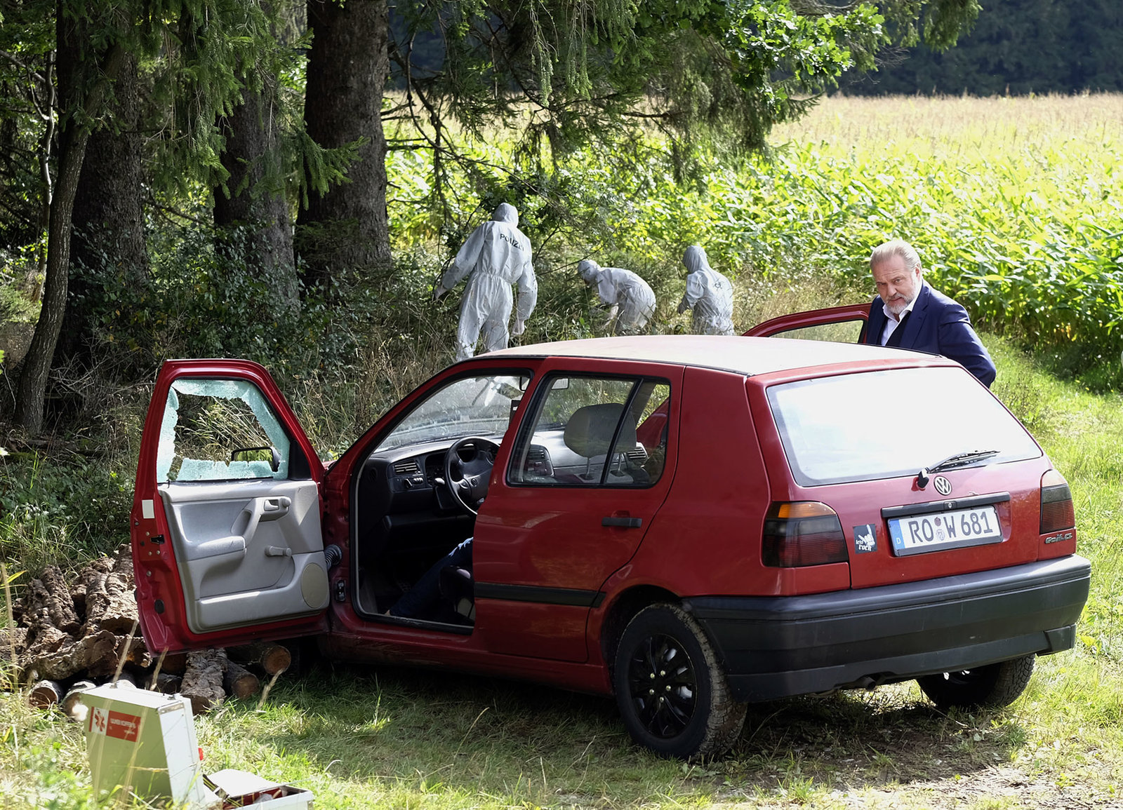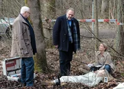 Spiel, Satz, TodDie Tote am Waldrand: Michael Ande als Gerd Heymann, Jan-Gregor Kremp als Richard Voss, Christina Rainer als Dr. Franziska Sommerfeld, Vivien Wulf als Alexa Hähnel (liegend)Bild: © SRF/ZDF/Jacqueline Krause-Burberg