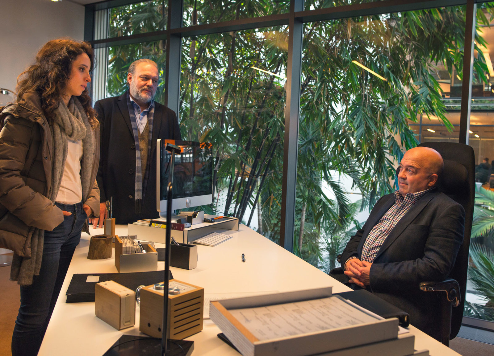 Tödliche IdealeBefragung des Bauinvestors durch die Ermittler : Stephanie Stumph als Annabell Lorenz, Jan-Gregor Kremp als Richard Voss, Florian Martens als Bernd BöllhoffBild: © SRF / ZDF/Hendrik Heiden