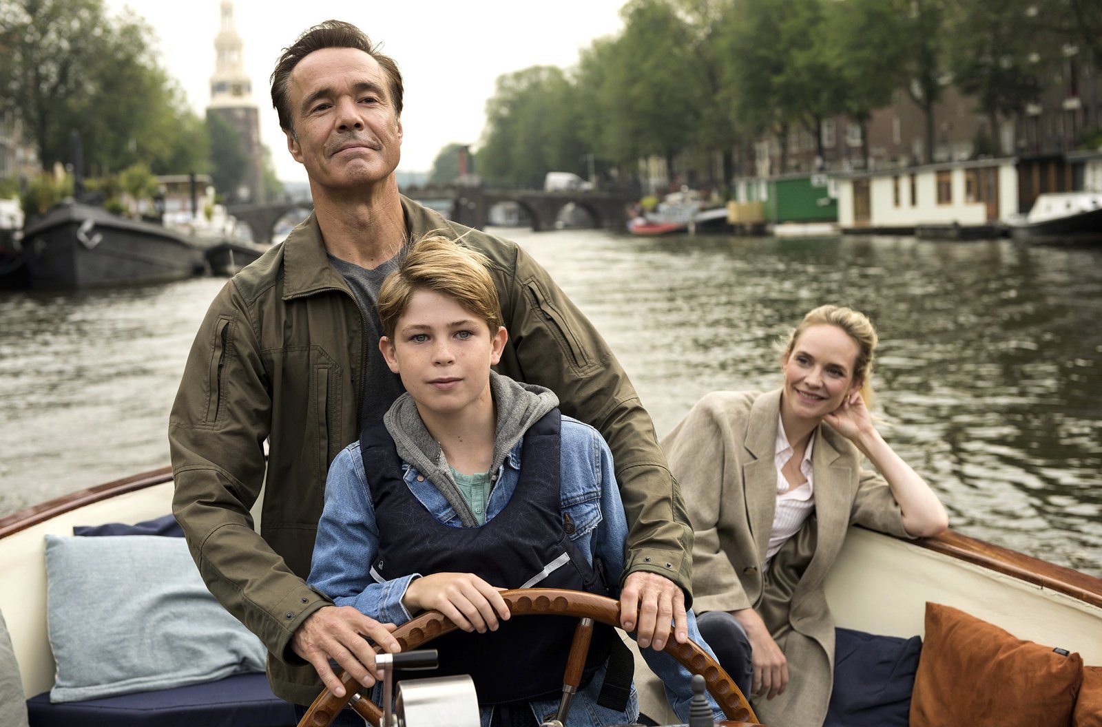 Das verschwundene KindAlex Pollack (Hannes Jaenicke) auf Bootsfahrt mit seiner Nachbarin Annika (Bracha van Doesburgh) und ihrem Sohn Sam (Robin Welten).Bild: © ARD Degeto/Martin Menke