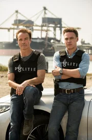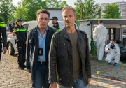 Das Mädchen ohne NamenGemeinsame Ermittlungen: Kommissar Bram de Groot (Fedja van Huêt, li.) und sein deutscher Kollege Alex Pollack (Hannes Jaenicke, re.).Bild: © ARD Degeto/Raymond van der Bas