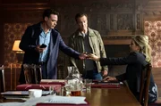 Das verschwundene KindBram de Groot (Fedja van Huêt, li.) und Pollack (Hannes Jaenicke) nehmen die Bürgermeisterin Susanne Verbeek (Tanja Jess) ins Visier.Bild: © ARD Degeto/Martin Menke