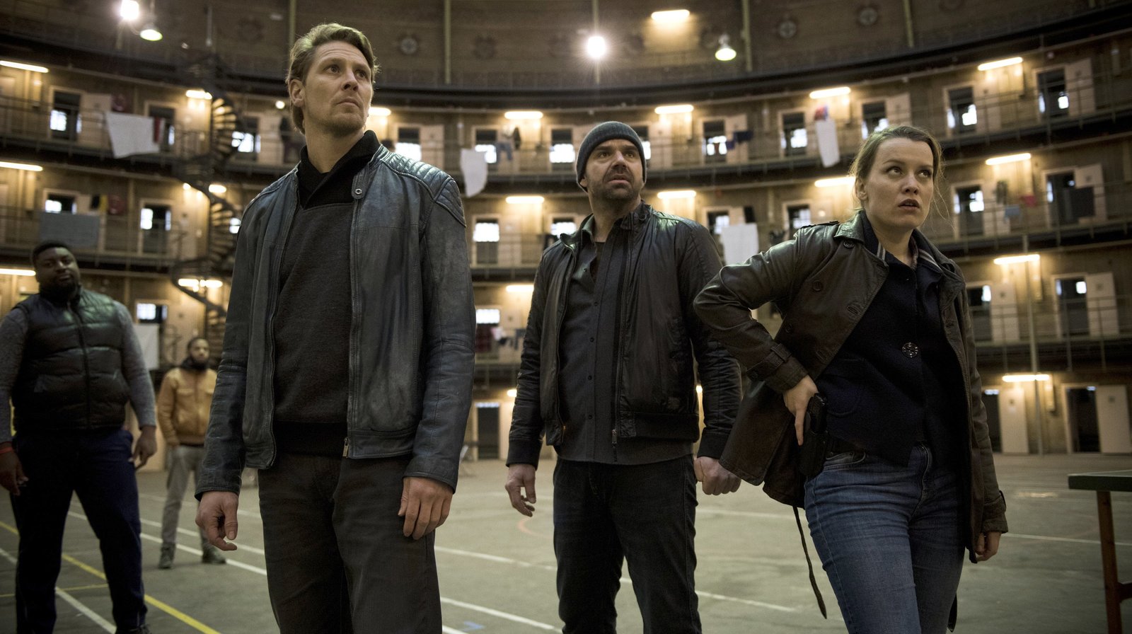 Auferstanden von den TotenDie Amsterdamer Polizisten Rijkaard (Gijs Naber, li.), Rutger (Peter Post) und Renée (Birgit Welink) suchen nach dem Überlebenden in einer Flüchtlingsunterkunft.Bild: © ARD Degeto/Martin Valentin Menke