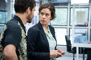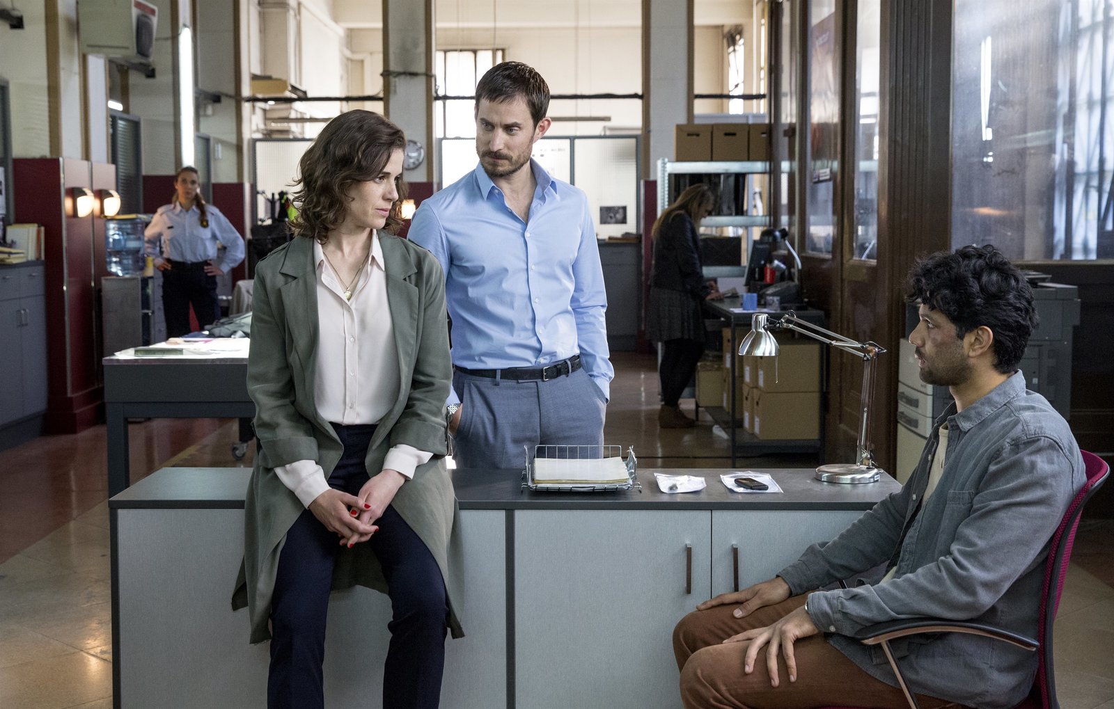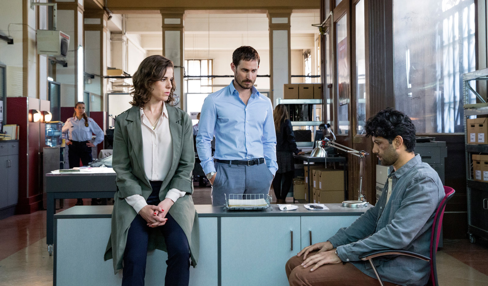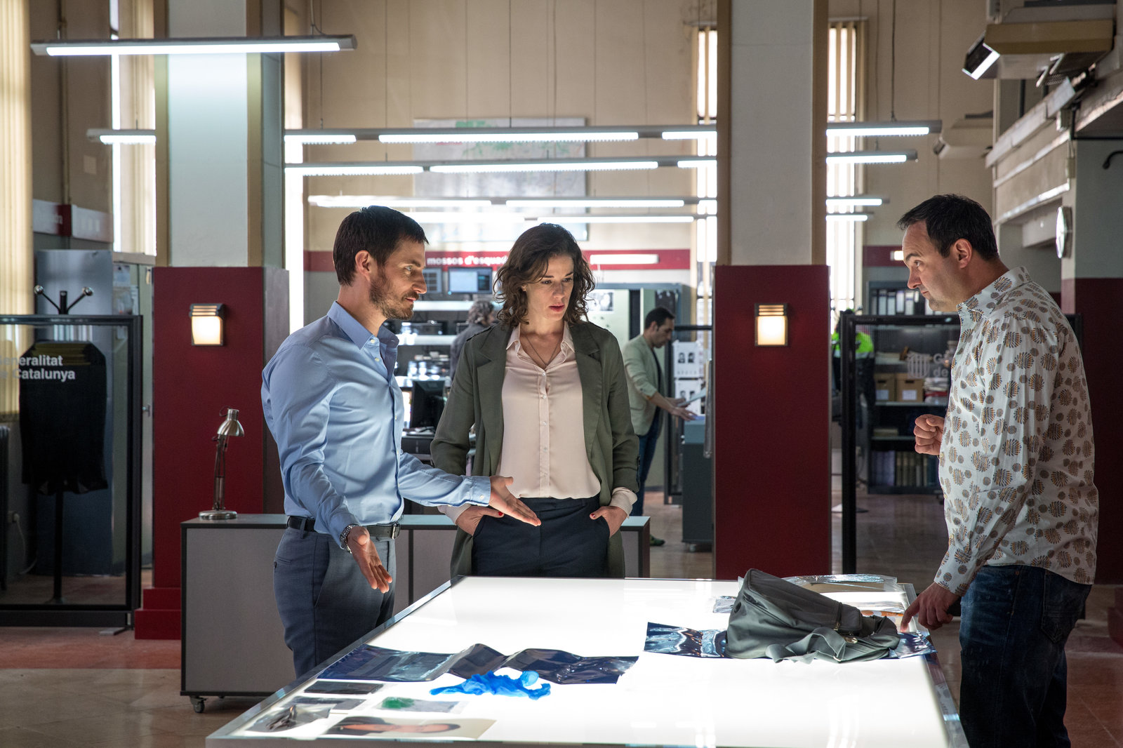 Tod aus der TiefeKommissar Xavi Bonet (Clemens Schick) und Partnerin Fina Valent (Anne Schäfer) vernehmen die verdächtige Unternehmerin Isabella Gutierrez (Isabella Parkinson, li.).Bild: © rbb/Degeto/Lucia Faraig