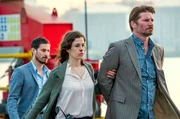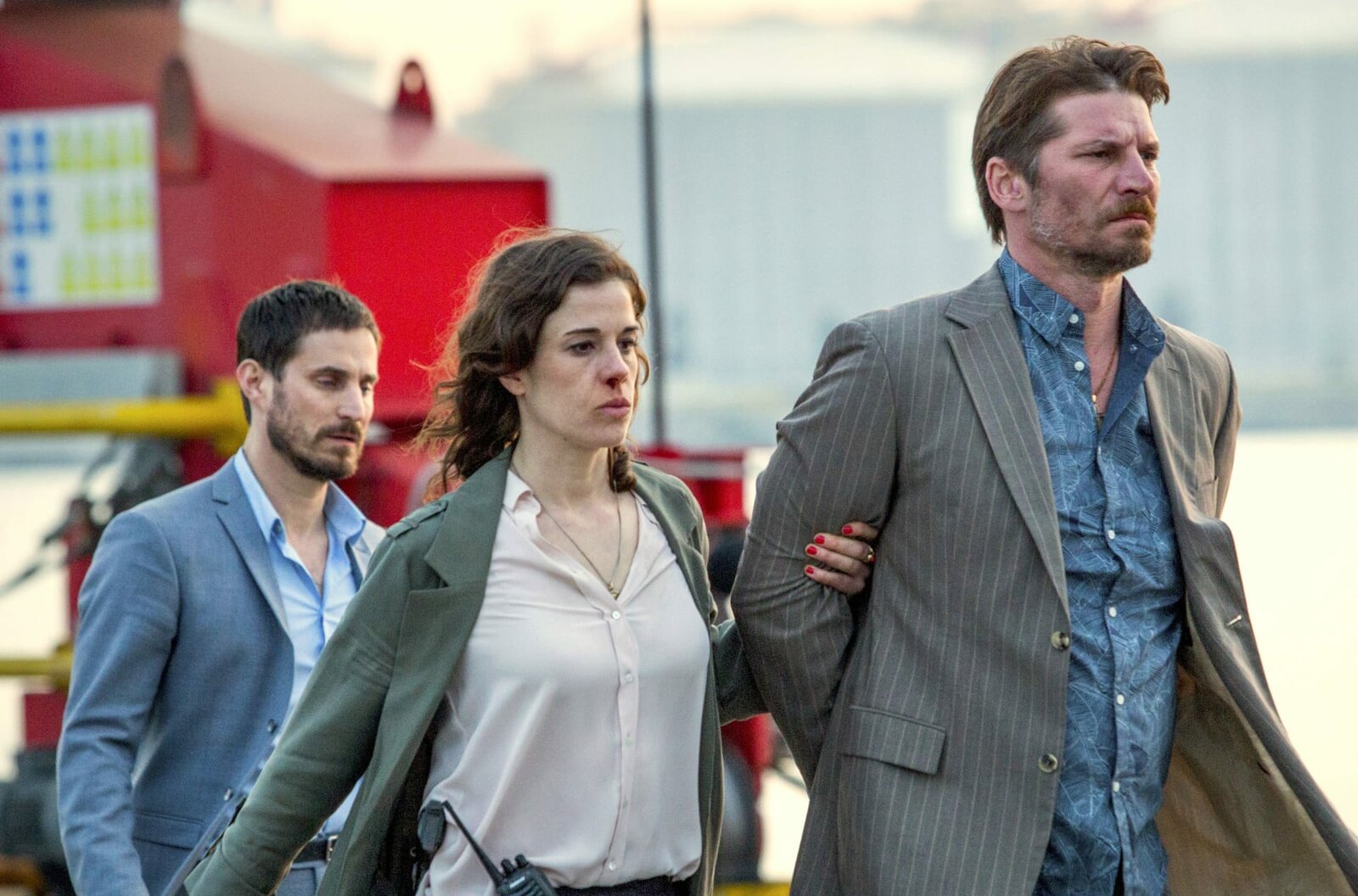 Über Wasser haltenIn Barcelona, einer der aufregendsten Metropolen der Welt, ermittelt ein außergewöhnliches Duo: Der eigenwillige, gut vernetzte Katalane Xavi Bonet und die selbstbewusste Ermittlerin Fina Valent, die als Alleinerziehende eine Doppelbelastung stemmen muss. In ihrem ersten gemeinsamen Fall müssen sie den Mord an einem illegalen Einwanderer aufklären. - Foto: Kommissarin Fina Valent (Anne Schäfer) und Xavi Bonet (Clemens Schick) nehmen den Gangster Gerard (Luka Peros, re.) fest.Bild: © rbb/ARD Degeto/Lucia Faraig