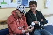 Der schlimmste Schmerz - Teil 1Martin (Hans Sigl, r.) amüsiert sich über seinen Freund Kahnweiler (Mark Keller, l.), dem die anstehende Untersuchung so peinlich ist, dass er sich maskiert hat.Bild: © ZDF und Stefanie Leo