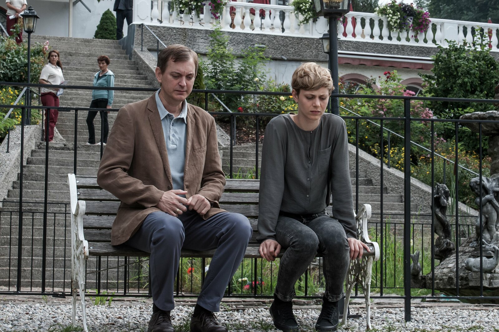 Zwei Mütter - Teil 1Irene Bornholm (Nicole Beutler, r.) und Dr. Roman Melchinger (Siegfried Rauch, l.) machen Kaffeepause. Honorarfrei - nur für diese Sendung bei Nennung ZDF und Stefanie LeoBild: © ZDF und Stefanie Leo
