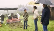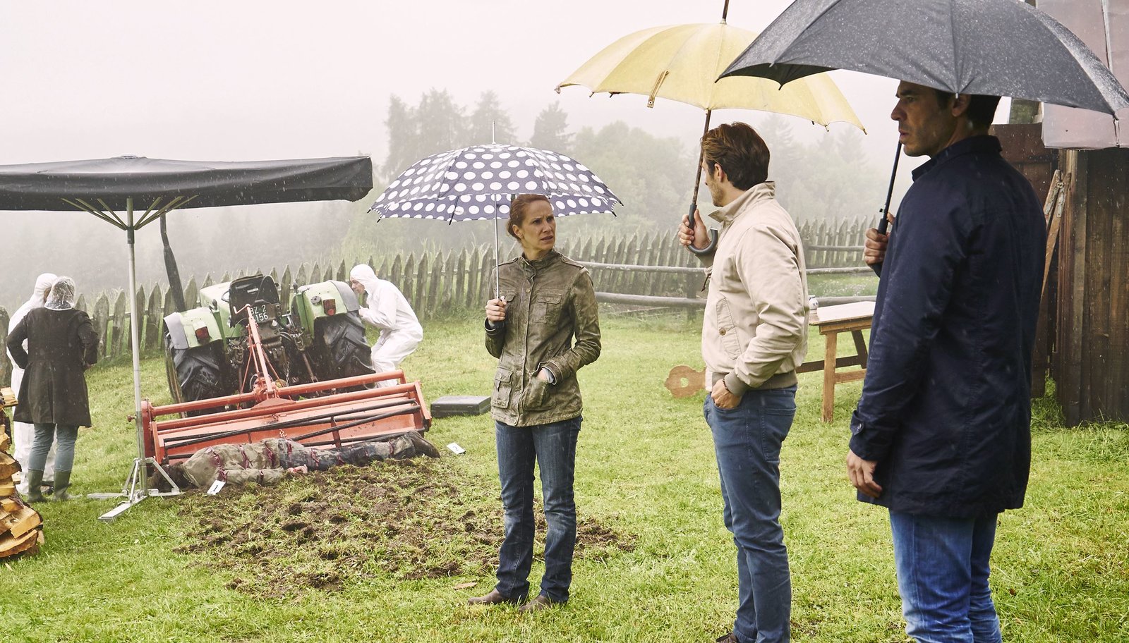 Kommissarin Schwarz (Chiara Schoras), Kollege Kerschbaumer (Gabriel Raab) und „Capo“ Zanchetti (Tobias Oertel) am Tatort: Hier wurde Winzer Grandl vom Traktor überfahren.