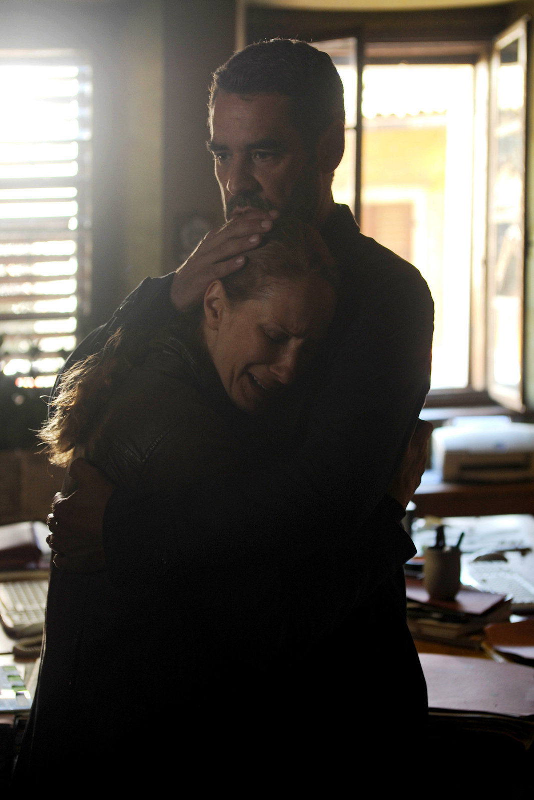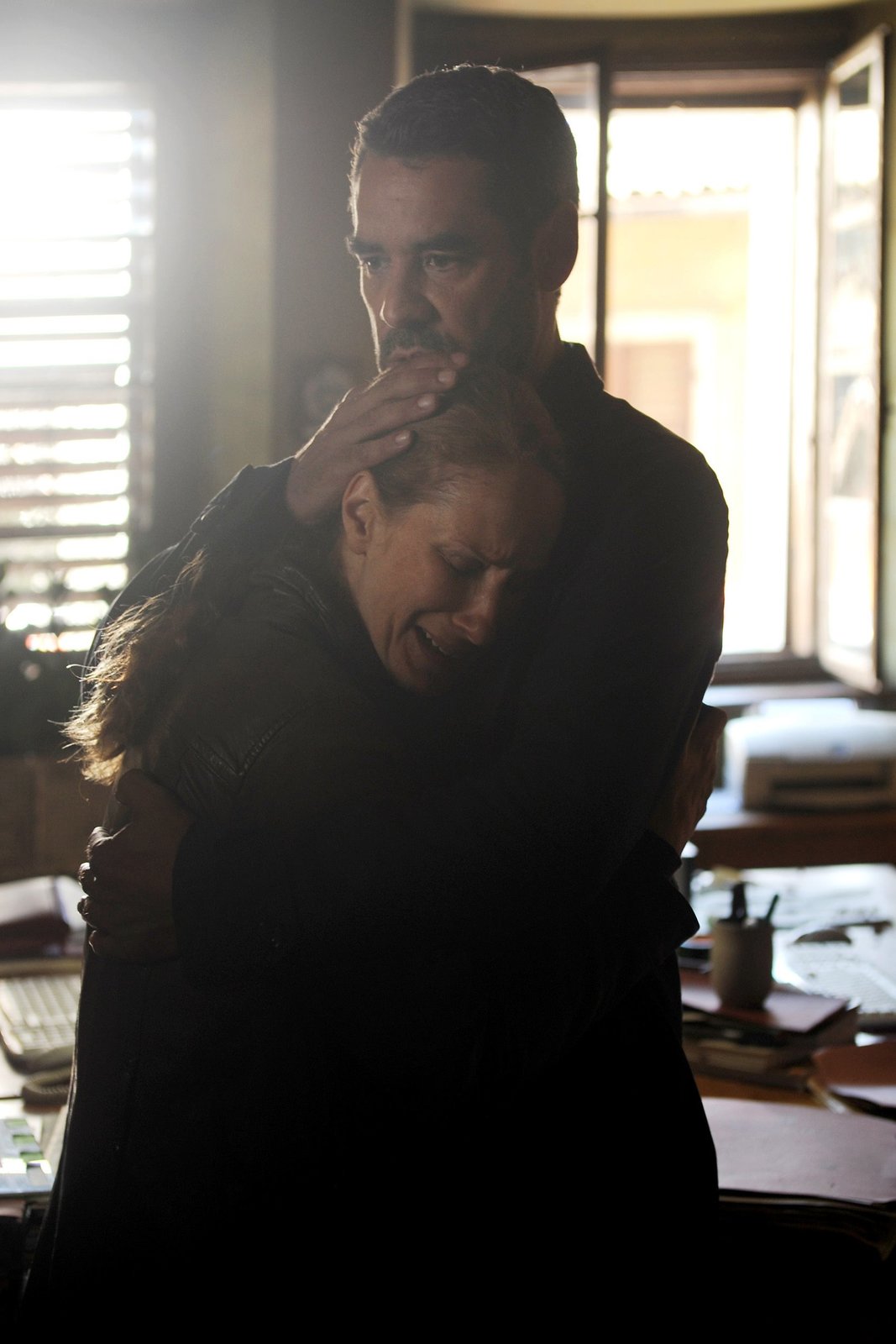 „Capo“ Matteo Zanchetti (Tobias Oertel) tröstet seine Kollegin Sonja Schwarz (Chiara Schoras), deren Mann von einem unbekannten Scharfschützen angeschossen und lebensgefährlich verletzt wurde.