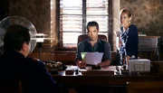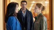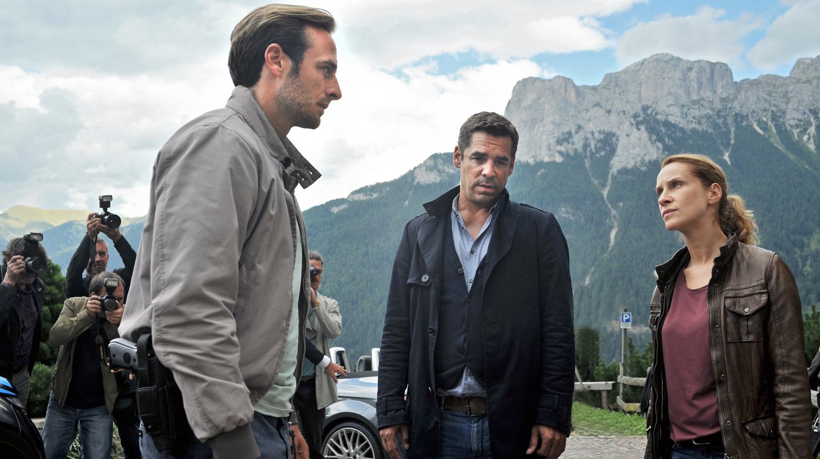 Blutrache„Capo“ Matteo Zanchetti (Tobias Oertel) und „Frau Commissario“ Sonja (Chiara Schoras) sprechen mit ihrem Kollegen Jonas Kerschbaumer (Gabriel Raab, re.), der am Krankenzimmer der schwerverletzten Mafiastatthalterin Giulia Santoro Wache hältBild: © ARD Degeto/Hans-Joachim Pfeiffer