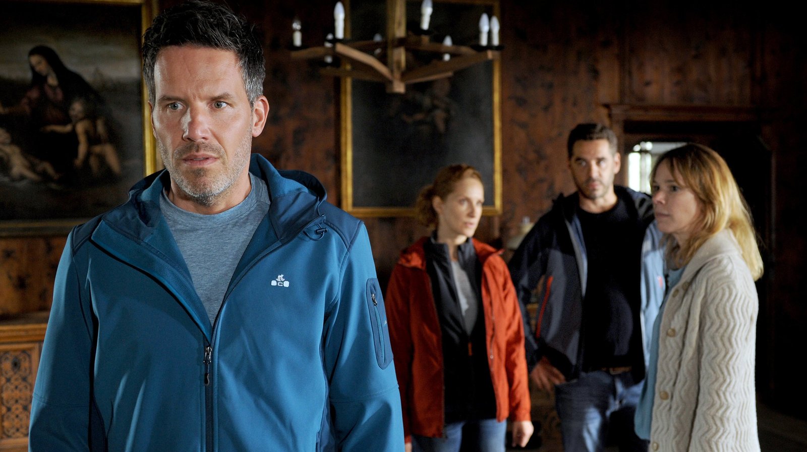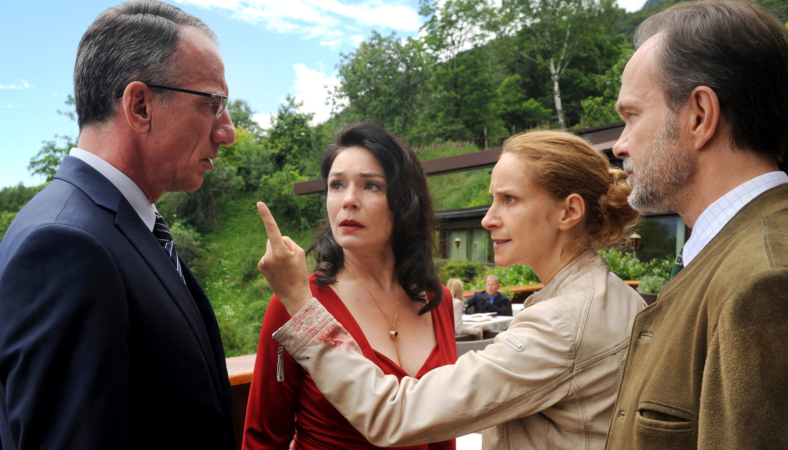 Am AbgrundKommissarin Sonja Schwarz (Chiara Schoras, 2. v. re.) droht Hotelier Stefan Keller (Heio von Stetten, li.) und dessen Frau Charlotte (Julia Stemberger, re.) im Beisein des Lokalpolitiker Hermann Bichler (Thomas Reisinger).Bild: © ARD Degeto/Hans-Joachim Pfeiffer