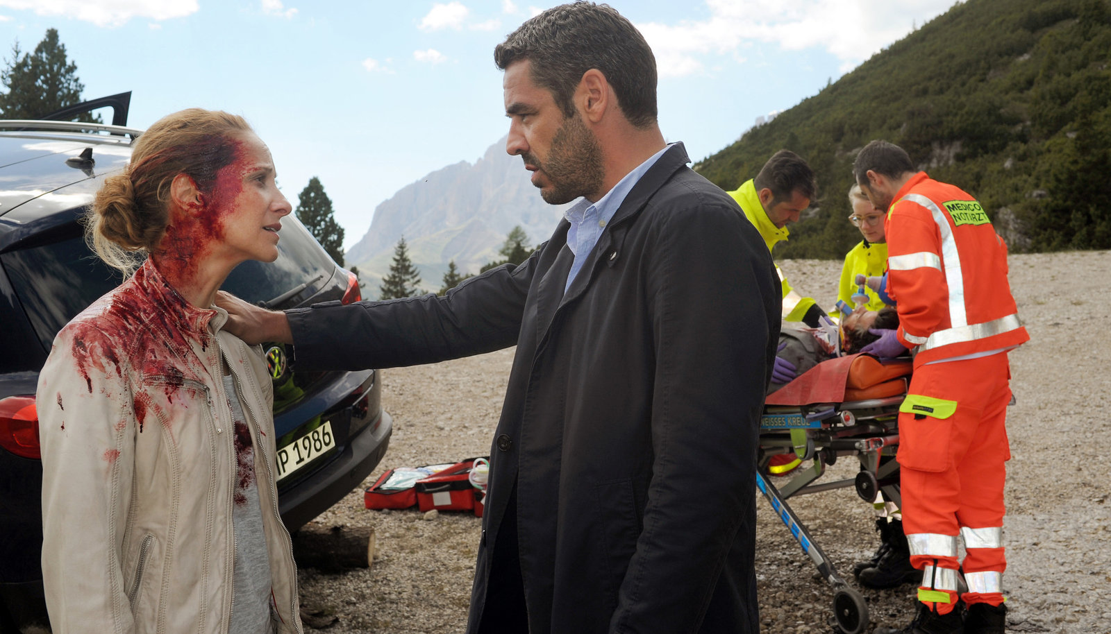 Am AbgrundMit viel Glück entkommt Sonja Schwarz (Chiara Schoras) einem Anschlag von einem Scharfschützen. Dabei wird allerdings ihr Ehemann von der Kugel lebensgefährlich velretzt. "Capo" Matteo Zanchetti (Tobias Oertel) versucht sie zu beruhigen.Bild: © ARD Degeto/Hans-Joachim Pfeiffer