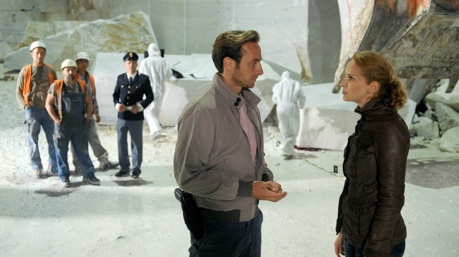 Falsches SpielJonas Kerschbaumer (Gabriel Raab) und Sonja (Chiara Schoras) müssen den gewaltsamen Tod eines Kraftfahrers in einem Marmorwerk aufklären.Bild: © ARD Degeto/Hans-Joachim Pfeiffer