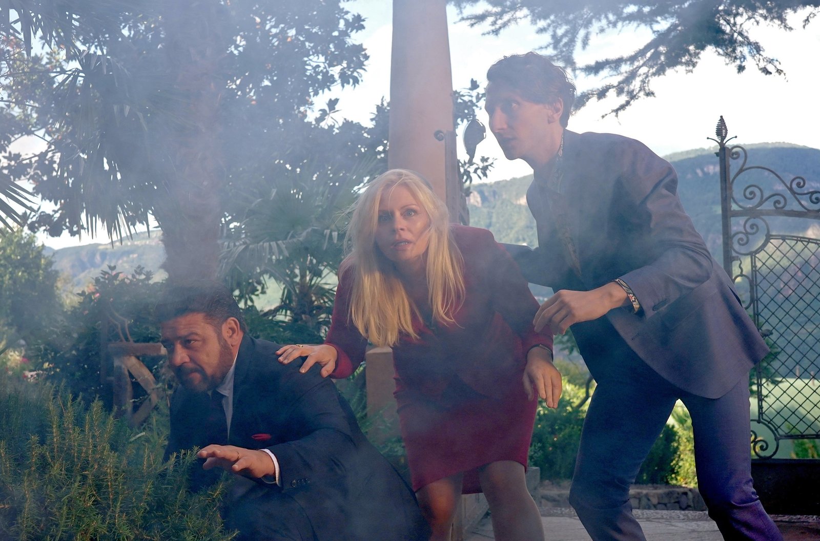 ZündstoffMafiaboss Lagagna (Leonardo Nigro), seine Statthalterin Santoro (Susanna Simon) und ihr Bodyguard Tornatore (Moritz Heidelbach) gehen bei einer Explosion in Deckung.Bild: © ARD Degeto/Hans-Joachim Pfeiffer