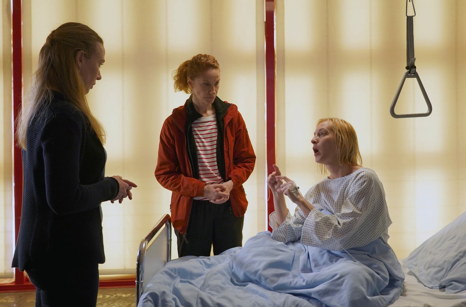 Tödliche StilleSonja (Chiara Schoras, Mitte) vernimmt die gehörlose Überlebende Emilia Gruber (Cordula Zielonka). Frau Malik (Kathrin-Marén Enders) unterstützt die Vernehmung in Gebärdensprache.Bild: © ARD Degeto/Hans-Joachim Pfeiffer