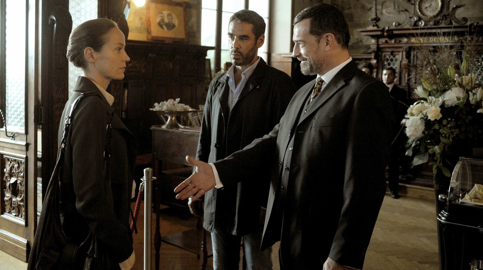 In der FalleCarla Pisani (Jeanette Hain) verdächtigt „Capo“ Zanchetti (Tobias Oertel, Mitte), für den Mafia-Statthalter Rossi (Thomas Sarbacher) zu arbeiten.Bild: © ARD Degeto/Hans-Joachim Pfeiffer