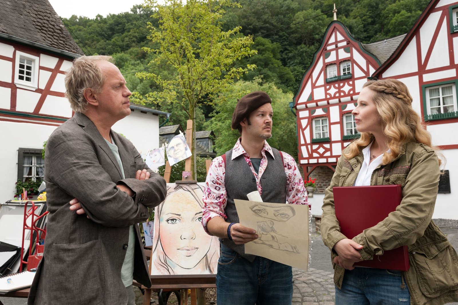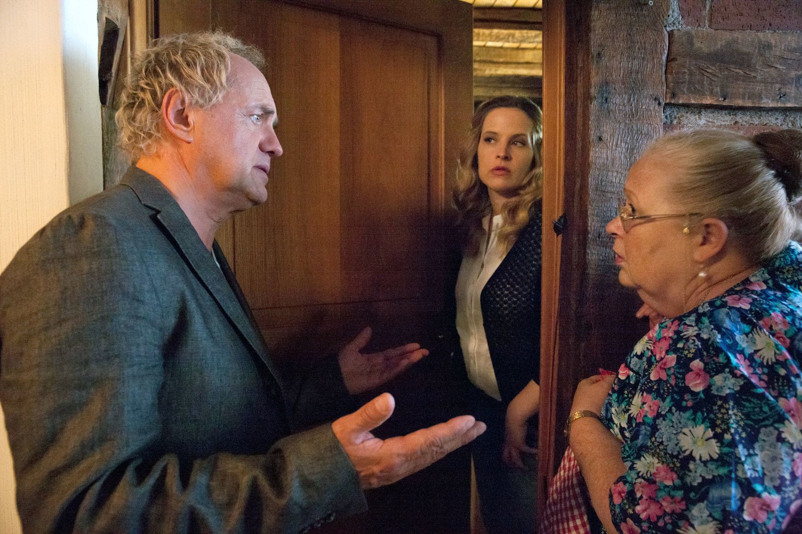 Wo die Liebe hinfälltKillmer (Uwe Ochsenknecht, links) hat Kati zur Schnecke gemacht, weil sie sich dem Einbrecher in den Weg gestellt hat. Kati (Diana Amft) hält dagegen - und Maler Lukas Brambach (Dominik Klingberg) kann sich nur wundern.Bild: © SWR/SWR/Thomas Kost